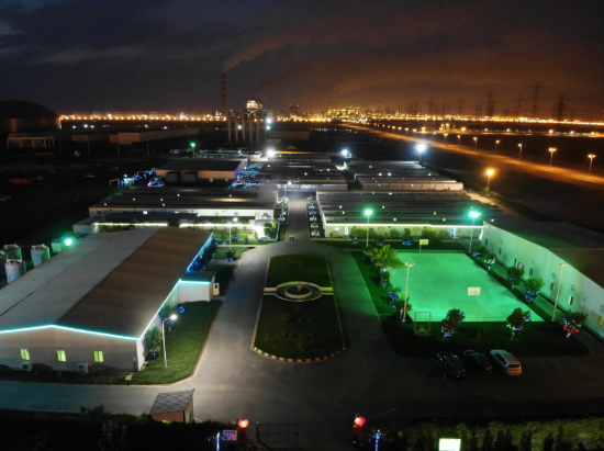 沙特吉赞 IGCC 燃气联合循环电站由山东电建公司EPC总承包,装机容量3850兆瓦,采用燃机联合循环技术发电,对于促进沙特西部经济发展、改善当地民生具有重大意义。项目营地毗邻红海东海岸,占地面积共9.96万平方米,配有宿舍、食堂、医疗室等生活设施,标准篮球场、多功能厅等文体娱乐设施。根据当地气候及土壤特点,营地购买引进椰枣树、夹竹桃等沙漠地区易存活植物,改善绿化园地;营地废水处理系统日处理量可达750吨,净化后的污水用于足球草皮绿化灌溉,使水资源得到了充分回收利用,既改善了营地环境,也为项目员工提供了良好的娱乐场所。